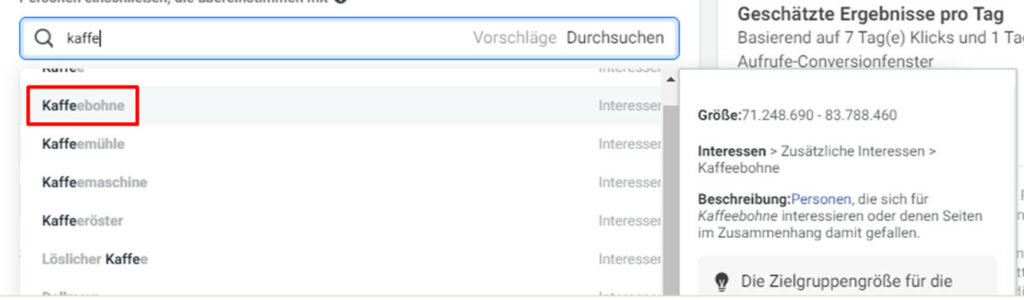 Bei Facebook kannst du bei der kalten Zielgruppe über demografische, sozioökonomische oder auch psychografische Interessen und Merkmale sprechen. Das kannst du dann sogar kombinieren, wie zum Beispiel, dass du nur Personen in Berlin ansprechen möchtest, die zwischen 24 und 34 Jahre alt sind, männlich und Interesse an Kaffeebohnen haben.